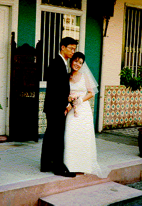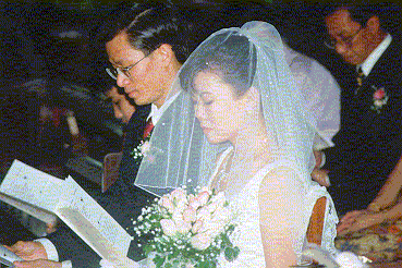 | We like this photo very much. Here we are listening demurely and attentively to the readings of our Wedding Mass. | ![]() |